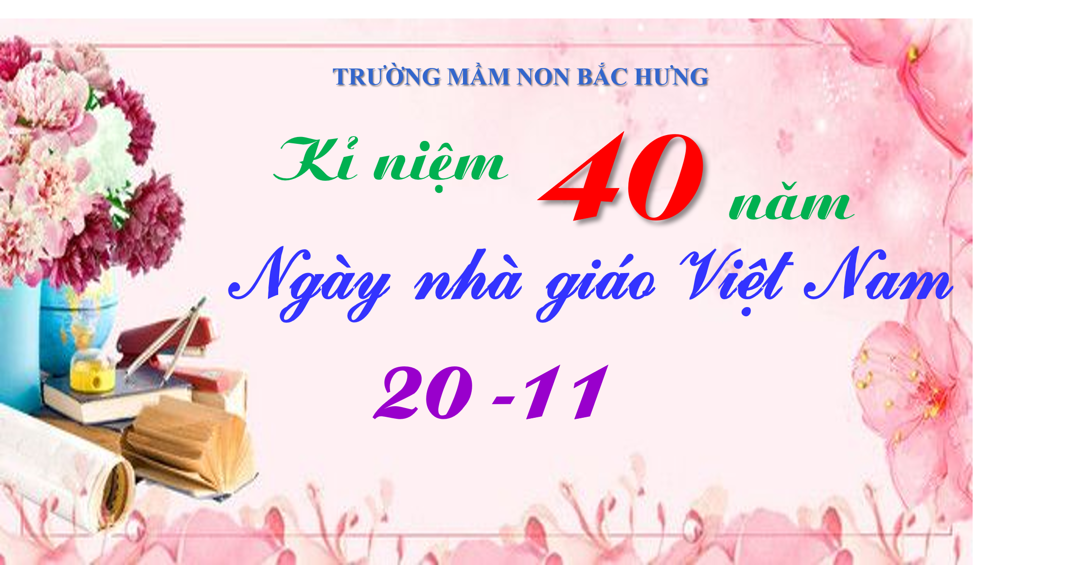 Nhân dịp kỉ niệm 40 năm ngày nhà giáo Việt Nam 20/11 tập thể CB, GV, NV trường mầm non Bắc Hưng xin được chân thành cảm ơn về sự quan tâm và giúp đỡ nhiệt tình cả về vật chất và tinh thần mà các cấp Đảng ủy, chính quyền địa phương, các ban ngành đoàn thể, hội cha mẹ học sinh và toàn thể nhân dân đã dành cho nhà trường trong thời gian qua. Xin chúc các “kĩ sư tâm hồn” luôn luôn mạnh khỏe, tiếp tục phát huy những thành tựu đã đạt được, khắc phục những hạn chế, cố gắng nỗ lực và quyết tâm hơn nữa, thực hiện tốt các phong trào thi đua, giảng dạy và học tập theo hướng chất lượng và hiệu quả, phấn đấu thực hiện tốt nhiệm vụ đã đề ra cho năm học 2022-2023, tạo tiền đề cho năm học tiếp theo. Chúc cho sự nghiệp giáo dục ngày càng phát triển. Đáp ứng niềm mong đợi của phụ huynh và nhân dân trong sự nghiệp trồng người.