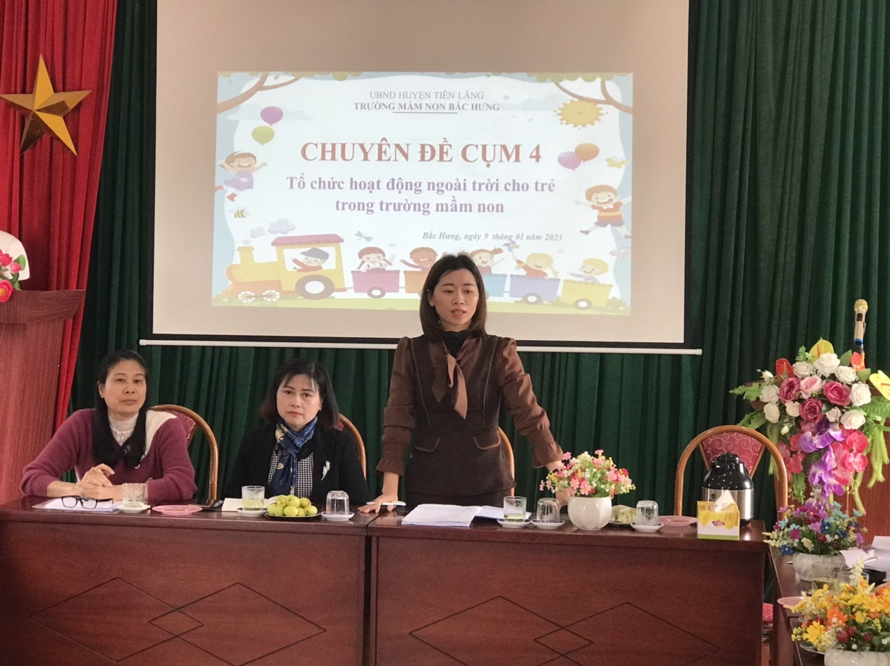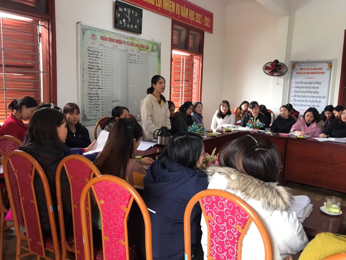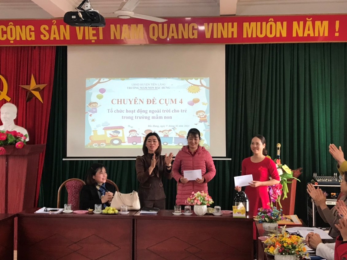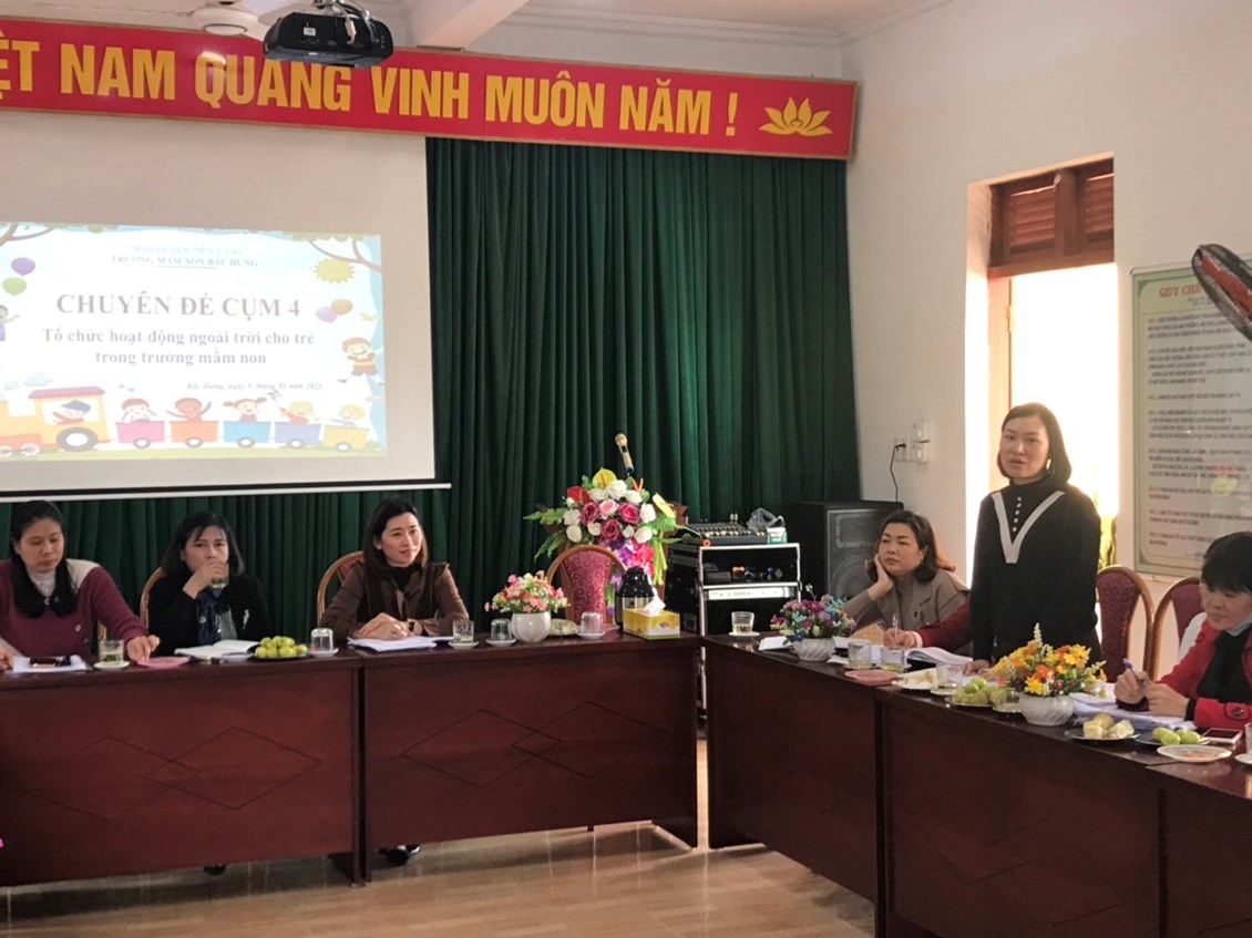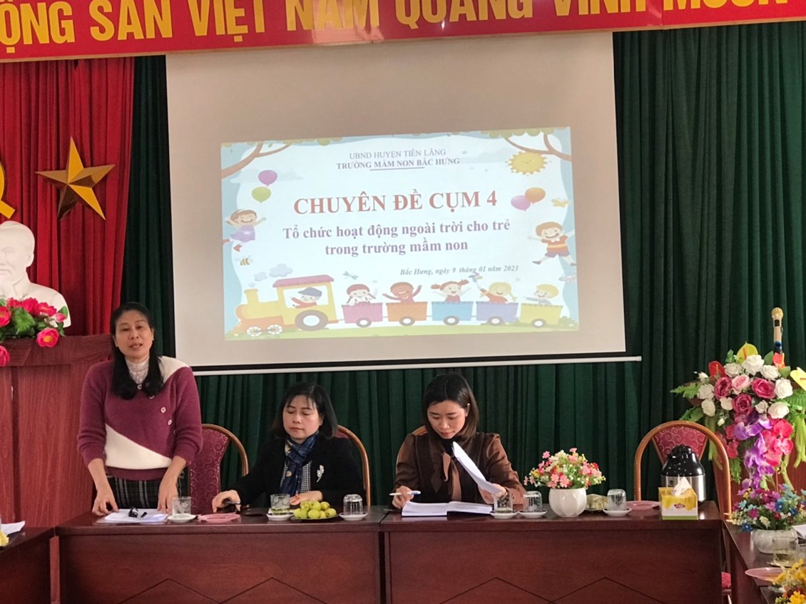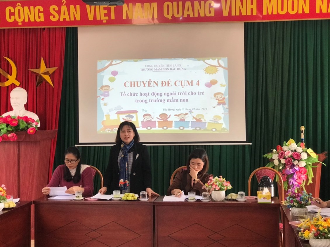 Sáng ngày 09 tháng 01 năm 2023, tại trường Mầm non Bắc Hưng- Huyện Tiên Lãng đã tổ chức sinh hoạt chuyên môn Cụm 4 sinh hoạt lần thứ 4. Trường thực hiện chuyên đề giải pháp sáng tạo “Tăng cường tổ chức hoạt động trải nghiệm cho trẻ trong trường mầm non, nâng cao chất lượng thực hiện chương trình GDMN” năm học 2022-2023.