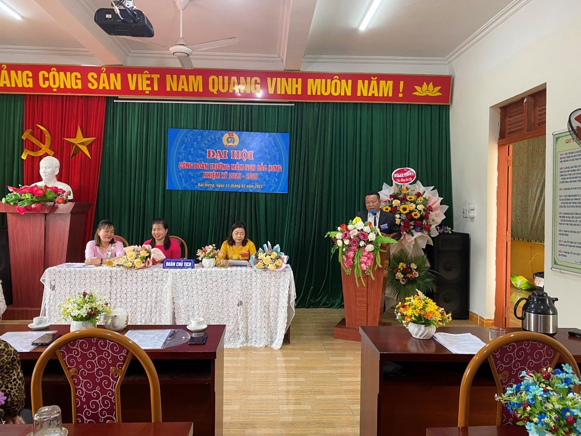 Trong nhiệm kỳ qua phong trào CNVCLĐ và hoạt động của Công đoàn trường mầm non Bắc Hưng luôn nhận được sự quan tâm lãnh đạo trực tiếp của lãnh đạo các cấp, rất vinh dự cho Đại hội Công đoàn trường mầm non Bắc Hưng hôm nay được đón tiếp đồng chí Nguyễn Thế Thìn – Phó Bí thư thường trực Đảng ủy xã đến dự và chỉ đạo Đại hội và có phát biểu ý kiến chỉ đạo công đoàn trường mầm non Bắc Hưng tiếp tục chăm lo đời sống cho cán bộ, công nhân viên và thường xuyên phối kết hợp với các công đoàn các khối cơ quan tổ chức cho cán bộ, giáo viên đi học tập nhiều hơn nữa.