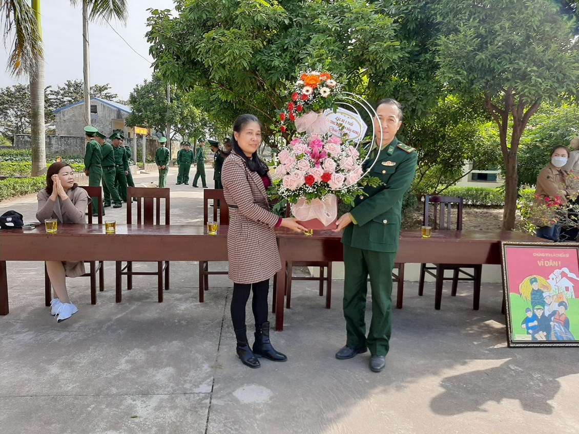 Cô Hoàng Thị Nhâm- Hiệu trưởng nhà trường tặng hoa chúc mừng các chú bộ đội