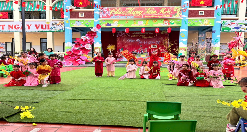 Chương trình được mở đầu với phần văn nghệ chào mừng đặc sắc do các bé biểu diễn. Những tiết mục múa, hát về mùa xuân, ngày Tết như “Liên khúc đón xuân”của các bé khối 5 tuổi “Bé đón xuân sang – bao lì xì đỏ”,các bé khối 4 tuổi “, “Tết ơi là tết” các bé 3 tuổi biểu diễn đã mang đến không khí tươi vui, rộn ràng, thể hiện sự hồn nhiên, tự tin của các bé mầm non.