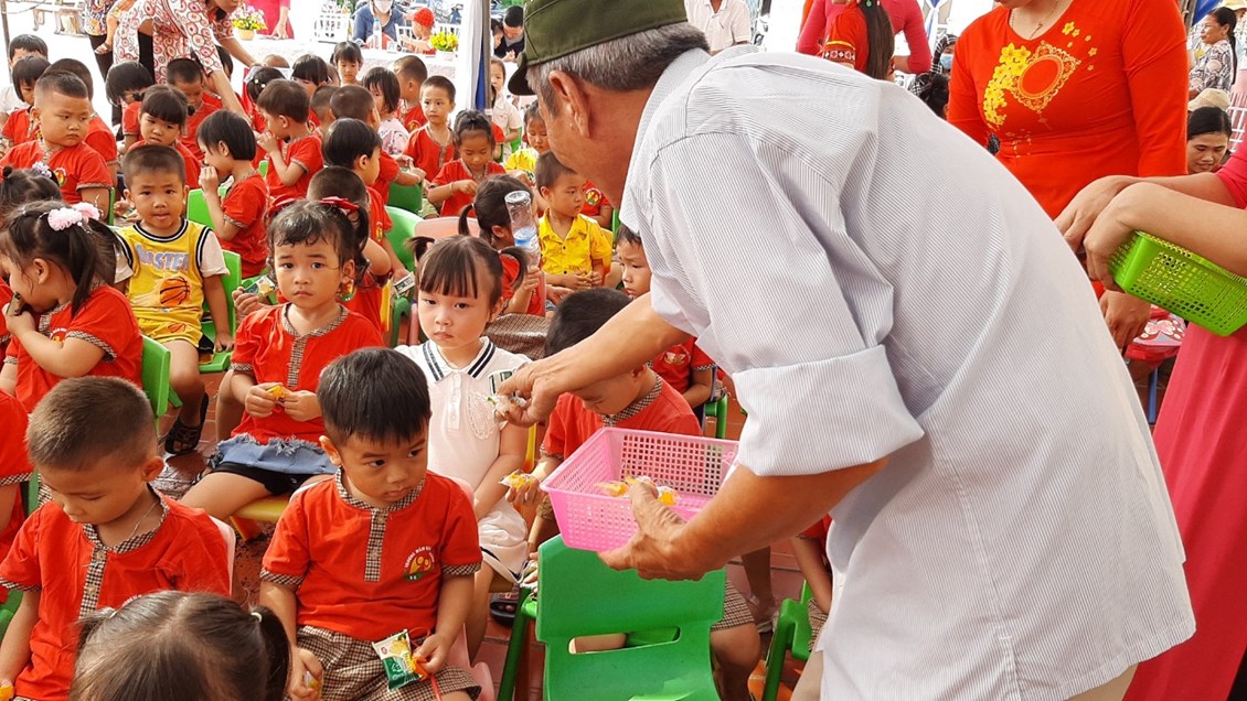 Các Cô bác lãnh đạo địa phương chia quà cho các bé