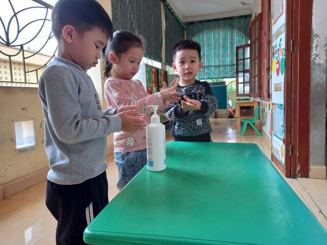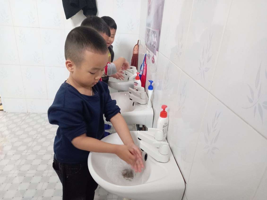 - Đảm bảo vệ sinh cá nhân trẻ sạch sẽ. Hướng dẫn trẻ giữ ấm, mặc đủ ấm khi thời tiết lạnh. Nhắc nhở trẻ biết che miệng nghi ngáp, hắt hơi, ho....Cho trẻ súc miệng hàng ngày bằng nước muối loãng sau khi ăn cơm và sau khi ngủ dậy.. Rửa tay hoặc sử dụng dung dịch diệt khuẩn cho trẻ trước khi vào lớp và sau các hoạt động. Nhắc nhở trẻ không đưa tay lên mắt, mũi, miệng.