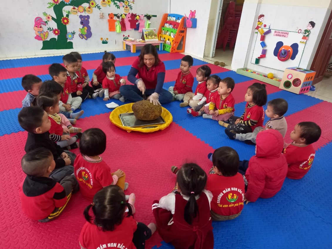 Hình ảnh cô và trẻ lớp NTA khám phá quả mít