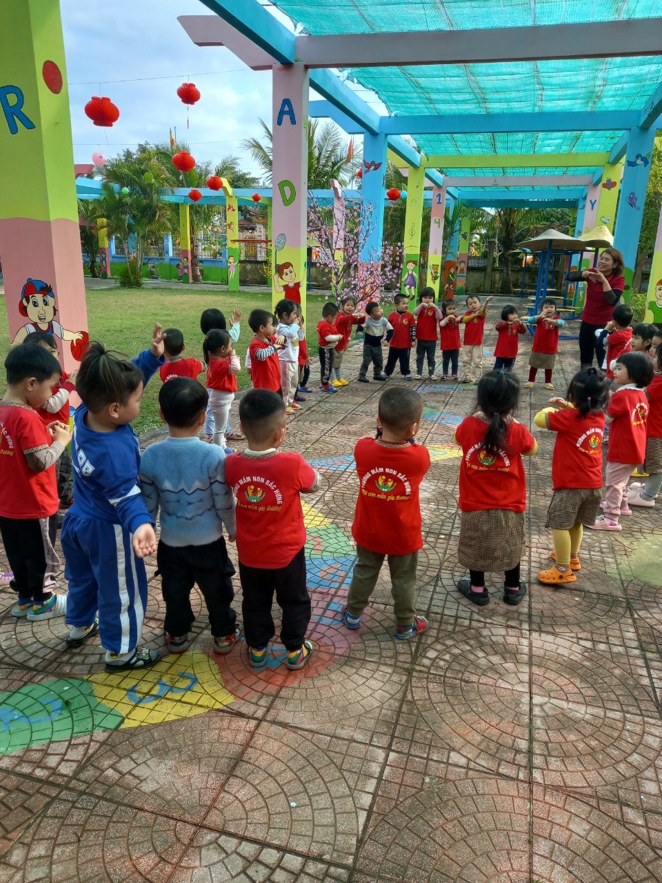 Hình ảnh cô và trẻ trong giờ hoạt động ngoài trời