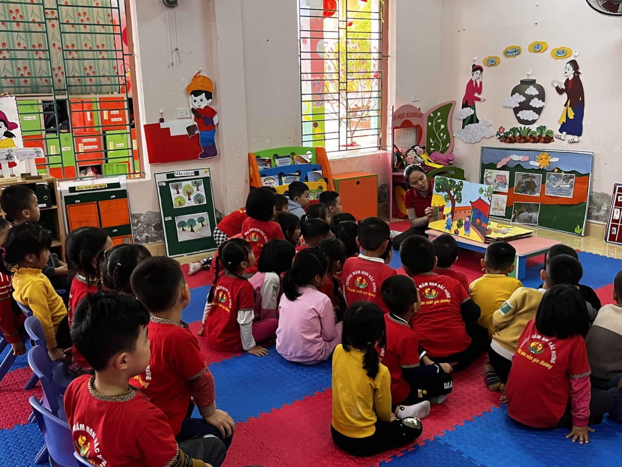 Cô và trẻ lớp 5TA trong giờ kể chuyện.